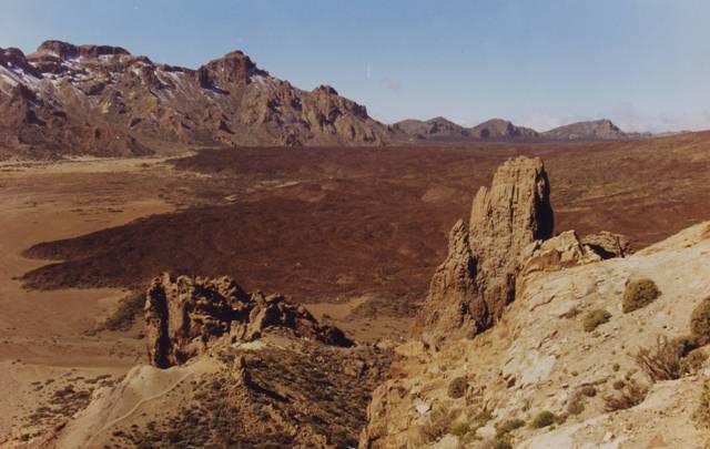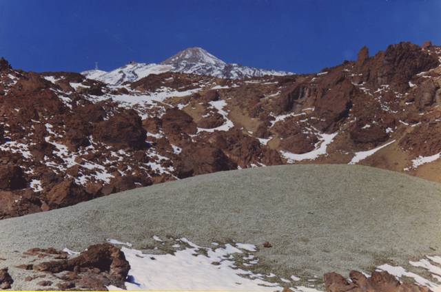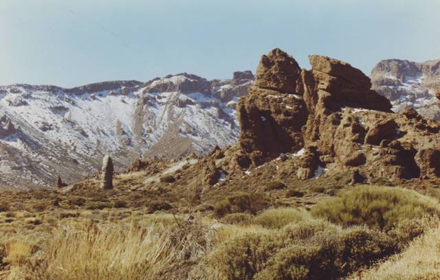 J’opte pour la solution intermédiaire : suivre le sentier sans couper à travers. Je grimpe jusqu’à une arête, espérant entrevoir le cratère. Dominique contourne un autre très petit cratère ? Quelques bombes parsèment le sol noir. Je ne sais pas pourquoi cet endroit me ait plus penser aux dunes du Sahara qu’à la caldera du Teide tout proche. Malheureusement, les nuages arrivent et cachent le Teide tout blanc sur la forêt de pins. Au loin, un homme appelle ; ses cris sont semblables à ceux des bergers qui rassemblent leurs troupeaux. Deux chiens énormes se dirigent vers moi. Ce sont eux les gardiens du parc. Nous en aurons la confirmation par des écriteaux. Nous avons un peu peur mais ils ne nous poursuivent pas.