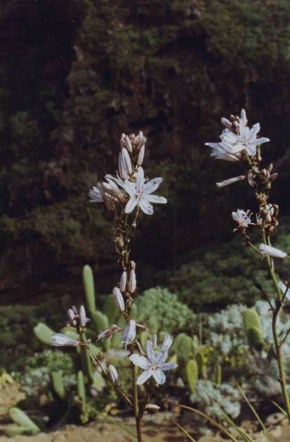 L’heure du déjeuner a largement sonné, nous cherchons un coin agréable pour le pique-nique. Pour une fois, nous dénichons du premier coup l’endroit idéal. Une pente cimentée nous conduit à une terrasse. De grosses touffes de marguerites Argyranthemum, d’euphorbes et d’une curieuse plante à hampe desséchée ressemblant à un parasol fermé, forment une végétation exubérante.