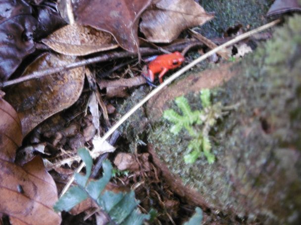J’aurais peut-être trouvé la grenouille rouge venimeuse toute rouge ou « blue-jeans » aux pattes bleues, tellement petites qu’il faut déployer le zoom tant qu’il ne faut surtout pas bouger alors qu’elles sautent et se cachent sous les feuilles. Le plus gênant C’est l’absence d lumière, dans la forêt pluviale règne la pénombre.