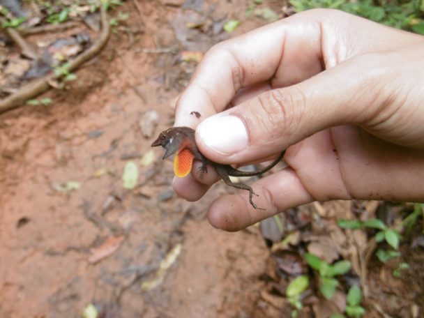 Découverte de la journée : l’anolis (petit iguanidé selon Wikipédia) qui possède une sorte de gorge extérieure comme une crête mais sous la gorge. Ils ne sont pas farouches. Alonzo les capture facilement me montre cet appendice. J’ai peur qu’il ne fasse du mal à ce petit animal délicat.
