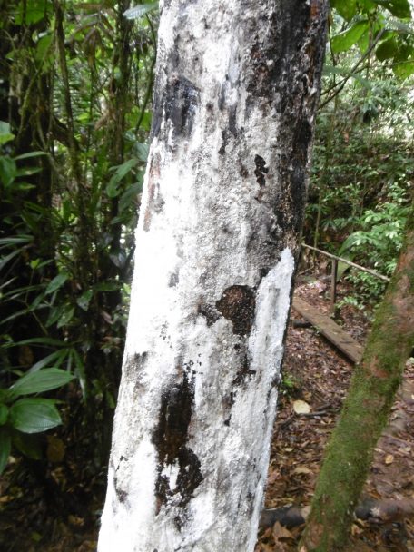 Certains arbres ont le tronc couvert d’une poudre blanche inflammable ; Alonzo a apporté des allumettes pour me montrer comment faire une torche éclairante avec une brindille trempée dans la sève. En séchant la sève devient blanche. On peut badigeonner la peau de ce blanc qui a des propriétés médicinales.