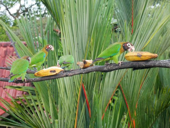 Les oiseaux m’on réveillée à 5h. Dès qu’ils commencent leurs chants j’ai une envie irrésistible de sortir les observer. Les Allemands se sont donnés rendez-vous à 6h . A 5h45, photographes et ornithologistes sont déjà prêts. Un employé de l’hôtel découpe des petites bananes, les accroche à un perchoir sur un arbre mort. Les oiseaux affluent attirés par les appâts. Les photographes arment leurs téléobjectifs gros comme des bazookas. J’ai trouvé une place avec une rambarde pour poser le Coolpix afin de ne pas trembler. Fascination des couleurs vives, bleu métallique, vert perroquet, tête rouge du pic (gris pas vert). Quand les perroquets arrivent les petits oiseaux s’envolent. Festival de couleurs. Tous attendent le toucan. Daignera-t-il se poser ?