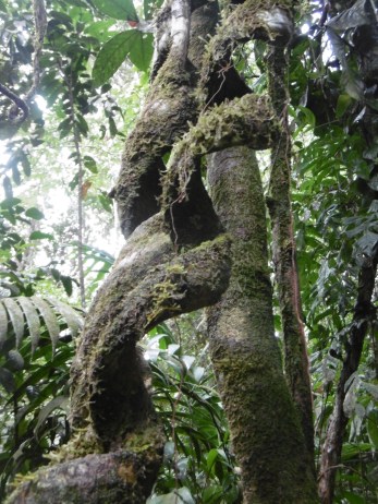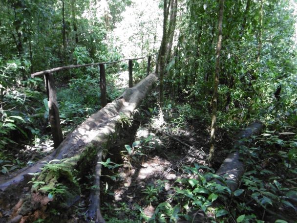 Nous suivons un chemin bien tracé qui s’enfonce dans la forêt pluviale. Des tranches de troncs d’arbres ont été rainurés pour une bonne adhérence. Alonzo m’a proposé un bâton que j’aurais bien dû accepter ! Entre appareil photo, jumelle lunette et carnet, je n’ai pas envie de m’encombrer. Après la pluie le sol est glissant.