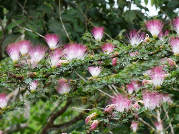 Petit déjeuner à 7h. Nous avons choisi une table près du bord au-dessus d’un arbre à soie (Albizia julibrissin) où on a mis un régime de bananes. Nous profitons du spectacle amusant : un écureuil paraît, corps très roux et queue très fournie grise et noire aux poils longs et bouffants. Puis un autre, puis trois qui sautent de rameau en rameau ; Ils mangent les bananes jusqu’à ce qu’un vol de petits perroquets verts se pose. Les perroquets disputent les bananes à l’écureuil qui leur donne des coups de pattes pour les éloigner.