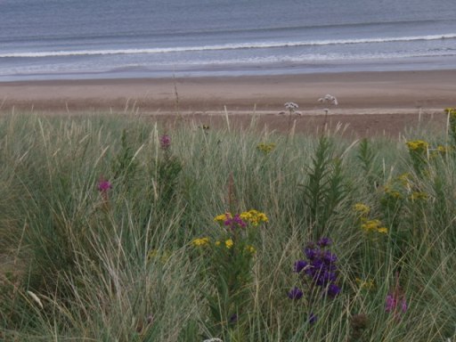 Nous poursuivons vers Montrose (prononcer le t) sur une toute petite route coincée entre la mer et la voie ferrée en pleine campagne. Dans le creux d’un vallon une petite route mène à la mer. Derrière les dunes, une plage immense.