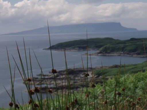 Le vent souffle fort de l’Est, disperse les nuages, et éloigne les midges. La température est hivernale. La surface de la mer bleue foncé est ridée de petites vagues blanches. C’est la première fois que nous voyons des vagues depuis que nous sommes à Skye. Au loin, l’horizon est très net. On voit partout des montagnes pointues très découpées les Hébrides ou la Côte Écossaise ?