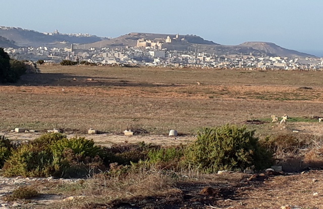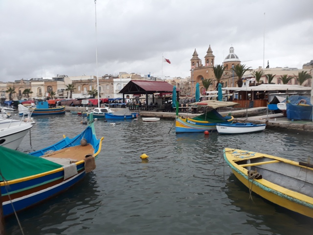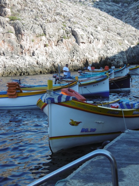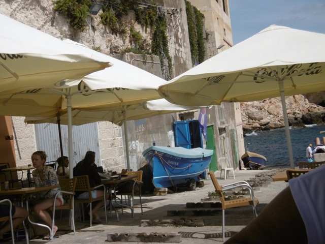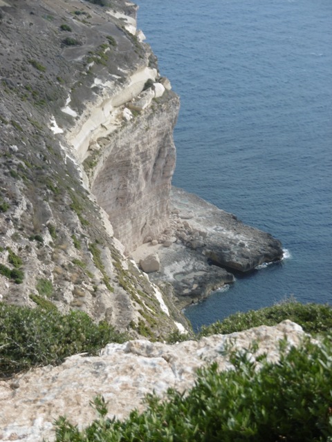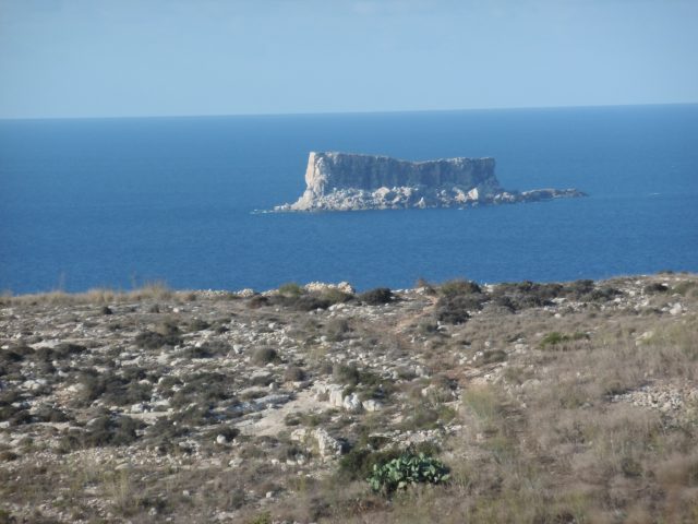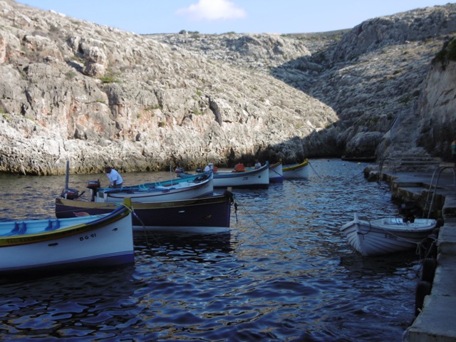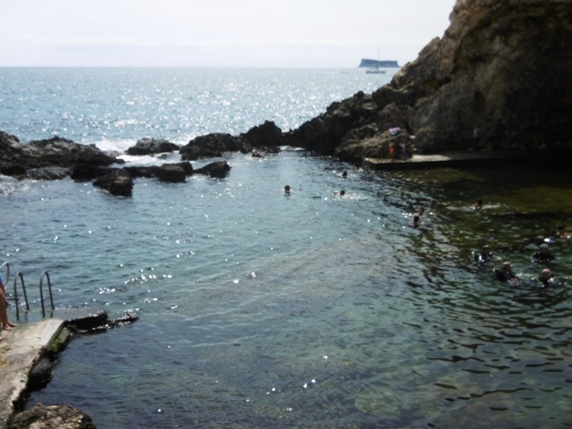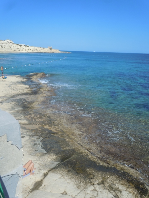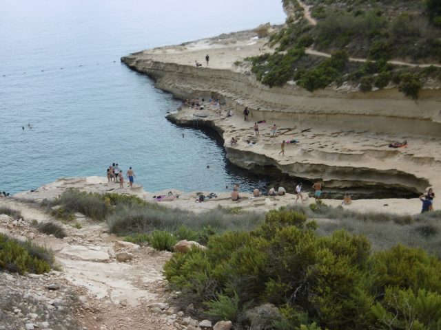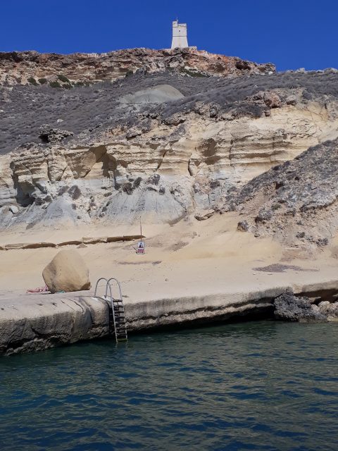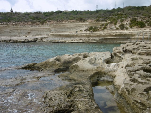 La vue sur Marsaxlokk est impressionnante. Ce que nous avions pris pour un simple village de pêcheurs est une ville très étendue sur une baie beaucoup plus grande que nous ne l’avions imaginée. Je comprends que les flottes soviétique et britannique aient pu s’y rencontrer. De l’autre côté du cap, vers la mer ouverte, de petites criques rocheuses très sauvages invitent à la baignade.