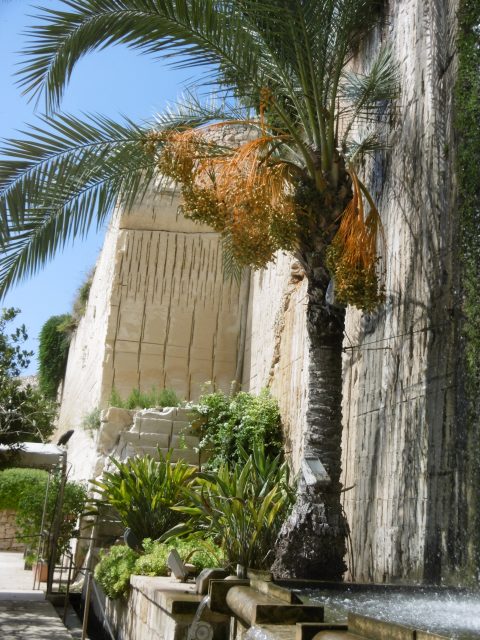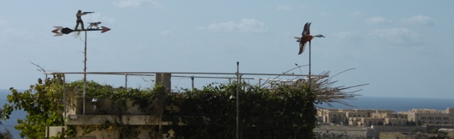 Près de notre maison, à Qawra, il y a des salines. Pour y parvenir je longe le bord de l’eau, découvre de nouvelles échelles pour se baigner, des petites plages de ciment insoupçonnées. Entre la route et la plage, deux étages de garages à bateaux et des cahutes de ciments avec des terrasses et des tonnelles, souvent des barbecues. Résidences permanentes ou rendez vous du week-end ? Un vieux monsieur et une dame prennent le frais, les jambes étendues sur un tabouret, la dame égrène son chapelet. Trois hommes s’affairent sur un bateau à moteur. Vie simple à mille lieux des hôtels à karaoké et piscine. A la fin des maisons le sentier se rétrécit et entre dans les roseaux. Un long serpent me dissuade d’aller plus loin. Sur le côté je découvre un chemin de planches qui mène à Kennedy grove qui est un jardin avec un bosquet de pins, des jeux d’enfants, des tables à pique-nique et une sorte de monument circulaire, genre tholos, au président assassiné. Un grillage sépare Kennedy Grove de la saline. Je dois remonter sur la route jsqu’à une passerelle métallique rouge qui enjambe un canal nauséabond où s’ébattent des canards.