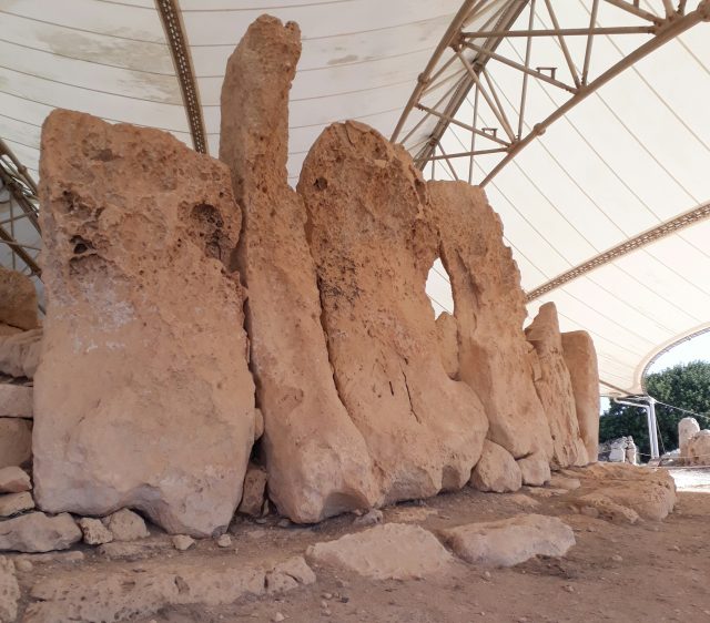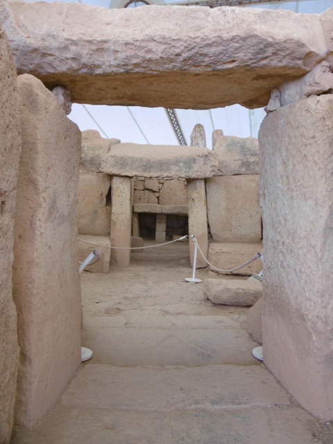 Les temples Tarxiens ne sont pas bien loin, sur la grand route j’ai remarqué un écriteau. Après, plus rien. Une dame très aimable encombrée d’un sac et d’un caddie bien rempli propose de nous guider ; Il faut faire de la place pour ses ballots « charity ! ». » A droite !», tape sur l’épaule de Dominique, « à gauche ! », nouvelle tape..petites rues, balcons maltais, camions de légumes. Le même que nous avons vu tout à l’heure et nous revoilà devant l’hypogée ! Nous ne trouverons jamais les Temples Tarxiens !