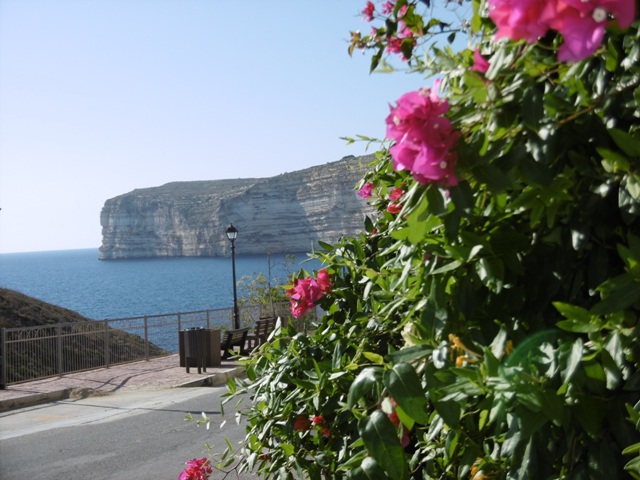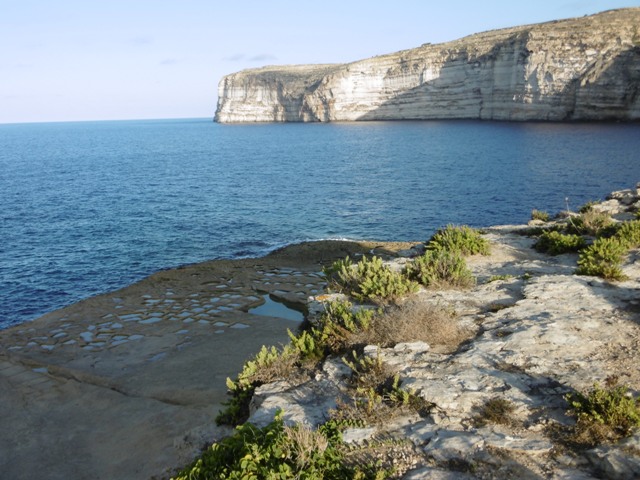 Retour à Gharb sur une jolie place : une fontaine, une cabine téléphonique rouge britannique (encore en fonction), un olivier et un panneau indicateur : circuit vélo jusqu’à Wied-il Mellah que je confonds avec Wied-il-Ghasri que nous cherchons. La petite route est neuve, elle passe au dessus d’une vallée encaissée (wied veut sans doute dire oued). Elle suit le ruisseau à sec (oued) jusqu’à une station de traitement des eaux pluviales (l’hiver ?) et arrive à la mer où on découvre une arche fenêtre rappelant la fenêtre d’Azur écroulée en mars dernier à Dwejra. Le panorama des falaises est impressionnant.
