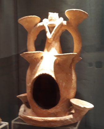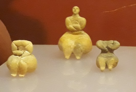 Deux têtes de pierre très réalistes précèdent la collection de petites femmes aux hanches fécondes et aux cuisses dodues, déesses-mères, nanas minuscules…un escargot, seul animal présent dans la vitrine. A côté des femmes de terre cuite, des épiphyses d’os de bovins sont ciselées en têtes minuscules. Dans une autre vitrine on a réuni des personnages masculins aplatis, casquées au corps en forme de trapèze ou de hache, des guerriers peut être ?