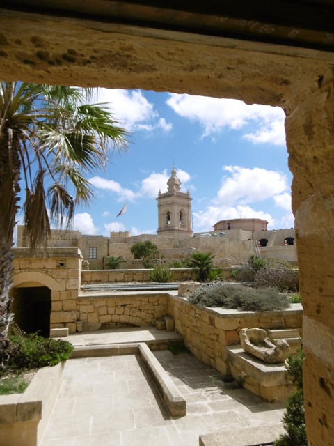La citadelle a été restaurée en 2016, les murs sont en parfait état, on a semé du gazon dans les douves. Deux promenades au choix : sur les remparts pour jouir d’une vue étendue sur Victoria et sa campagne ou le parcours encore ombragé. Des remparts je découvre les dômes impressionnants des églises dispersées u peu partout. Dès que j’entends des cloches je bascule l’appareil photo en caméra, mais je me lasse rapidement. Les cloches se déchaînent tous es quart d’heure. Par ses cloches et ses énormes églises les Chevaliers de Malte se rappellent à notre souvenir. Au loin le trait bleu profond de l’horizon marque aussi l’omni-présence de la mer. Gozo est une petite île ! J’entre dans la forteresse par une porte discrète et traverse l’épaisseur des remparts pour aboutir par surprise au Musée Archéologique dans une rue tranquille.