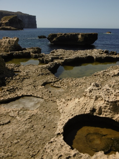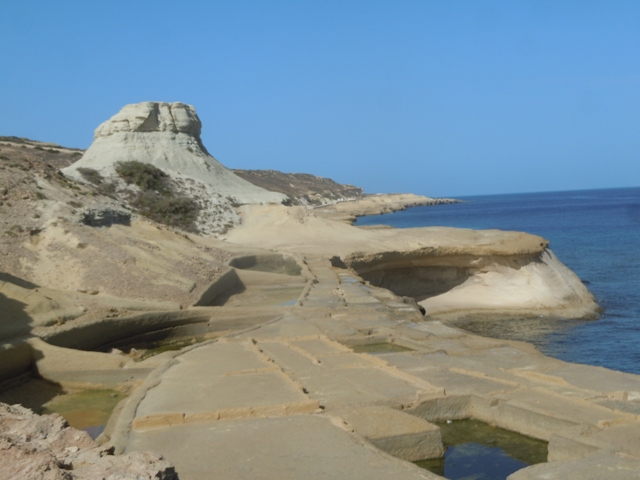 Les petits minibus blancs des plongeurs et des touristes sont garés à proximité. La promenade à pied me tente. Je me voile dans mon paréo jaune sénégalais. S’il avait été plus grand j’aurais volontiers imité les femmes Maures des environs de Saint Louis du Sénégal. Dommage que les islamistes aient confisqué à leur profit les voiles ! Un paréo comme voile sur le tankini c’est peut être une tenue ridicule mais bien confortable. La falaise de sable est creusée en courbes souples coiffée d’Upper Coralline comme à Xlendi. Deux portes s’ouvrent sur une caverne troglodyte où selon Evasion sont entreposées les pompes permettant d’élever l’eau de mer dans les bassins situés nettement au dessus du niveau de la mer. Comment faisaient les Romains qui ont exploité les premières salines ?