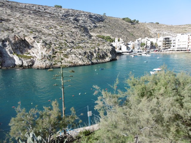 Un petit pont de pierre franchi une étroite vallée. Des marches montent vers une tour carrée. Comme je ne trouve pas le départ du sentier, je descends une belle allée dallée vers le village et découvre la baie étroite enserrée dans les hautes falaises et une toute petite anse très étroite « la plage des dames » où se baignaient à l’abri des regards les nonnes du couvent. Avant 7h nombreux habitants promènent leurs chiens. Des hommes vont à la pêche. Plusieurs barques quittent le port. On se salue « good morning » très british ou « bonjou » en maltais.