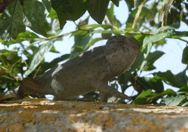 Le chemin vers la sortie est bordé par une ferme bio aux magnifiques grenades, poivrons et autres légumes. Sur le mur un caméléon se donne en spectacle, il riboule des yeux comme tout caméléon qui se respecte.