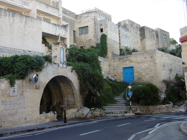 Le GPS nous guide vers le centre de Victoria sur une longue rampe qui monte de Xlendi à Fontana à travers une campagne cultivée de tout petits champs ou jardins en contrebas. A l’entrée de Fontana deux grottes contiennent des sources auxquelles les habitants remplissent des jerricans et des seaux. Nous empruntons ensuite des rues étroites entre de belles maisons à loggias fermées (ou bow windows). La pierre est habilement ciselée, sculptée de balustres, colonnes torses, fleurs ou rosaces.