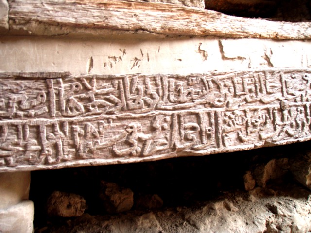 Sur les murs, des figures animales et des calligraphies : ma préférée est une sorte d’ibis qui porte « bismila el Rahim… » dessiné sur ses ailes. Sur un autre mur je distingue un cheval ailé (les ailes sont formées par un oiseau entier empaillé qui semble surgir du mur) en dessous une tête de mouton est aussi incrustée dans la maçonnerie. C’est la lecture de la calligraphie qui donne la clé : il s’agit du sacrifice d’Abraham survient le mouton qui sauvera l’enfant. Pour le cheval ailé, interprétation personnelle : il s’agit peut être de la monture du Prophète ?