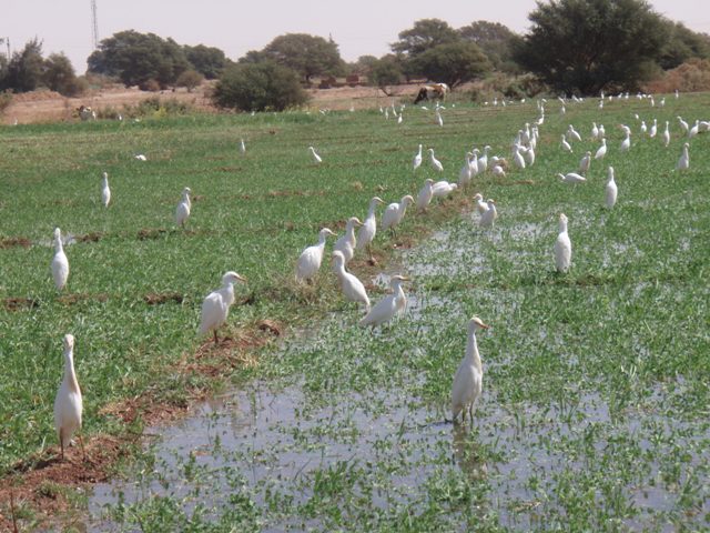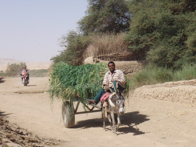 Nous demandons qu’on nous laisse nous promener dans les champs seules, pour prendre des photos. Des vaches paissent tranquillement. Une compagnie d’aigrettes blanches arpente la parcelle inondée. Dans un chemin adjacent nous croisons plusieurs carrioles à ânes Pour prendre une photo d’une charrette chargée de luzerne, l’ânier, la quarantaine arrêt aimablement son équipage et en profite pour consulter ses SMS ou ses appels en absence sur son téléphone cellulaire. Un vieux monsieur enturbanné nous propose même une promenade.