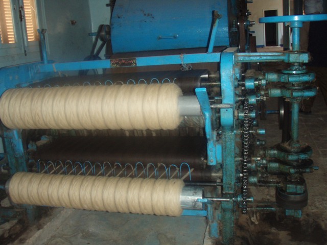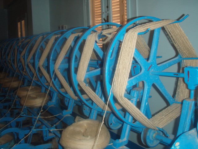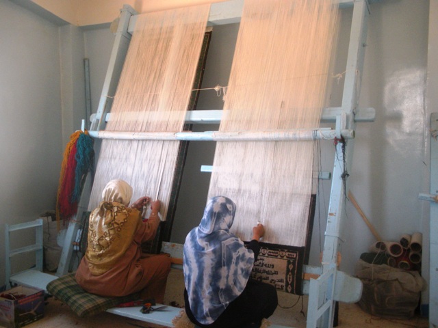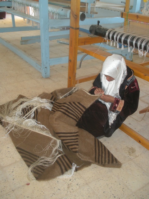 Une dame voilée nous accueille, la visite est payante et guidée 3$E. Elle ne parle pas du tout anglais mais ce qu’elle nous montre se passe de commentaire : les tas de laine brute et sale attendent la lavage dans des grandes cuves en ciment (aujourd’hui vides). Au rez de chaussée de grosses machines cardent, pressent filent et bobinent la laine brute maintenant très claire. La dame me fait soupeser un écheveau léger et très doux. A l’étage, des jeunes filles tissent sur de grands métiers des kilims majoritairement en laine brute marron ou beige. Certains sont rayés d’autres à damier ou à carreaux compliqués de motifs géométriques. Au fond de très jeunes nouent des tapis avec des textes (du Coran probablement) sous l’œil sévère de la maîtresse toute voilée de rose. Tout le monde se prête avec gentillesse à la séance-photo. Par discrétion on les photographie plutôt de loin et de dos. A leur regard, on vit bien qu’elles auraient aimé des portraits (si la dame rose n’avait pas été là). Dernière étape : le magasin. Les kilims sont immenses, les tapis destinés à la prière. Notre hôtesse au voile marron n’est pas étonnée que nous n’achetions rien.