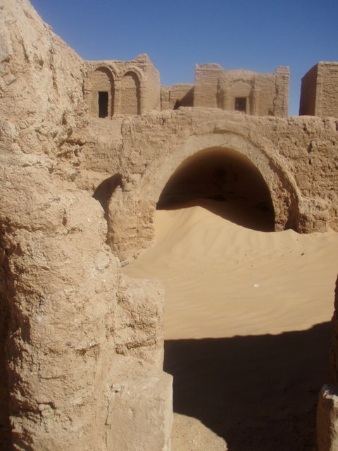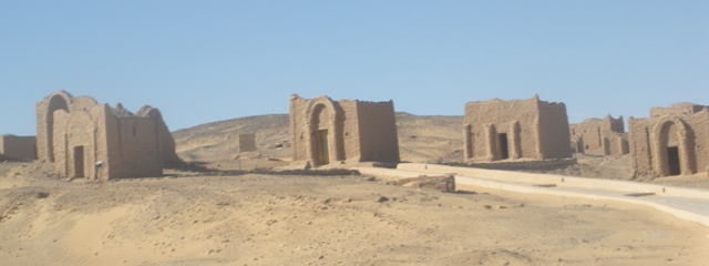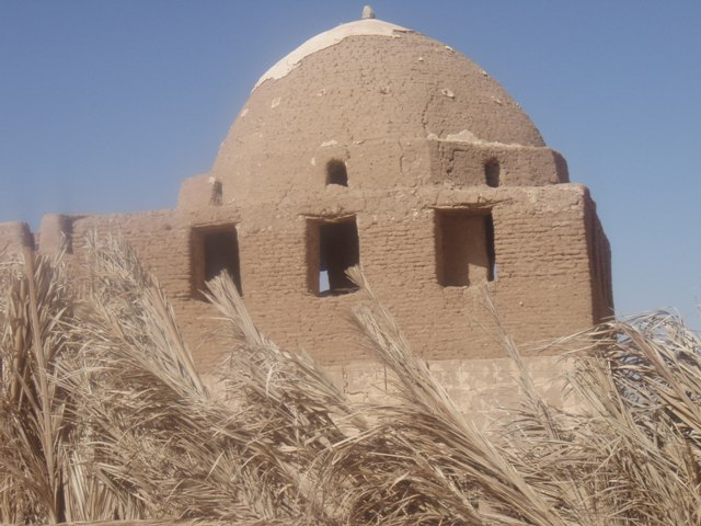 De loin, l’impression est saisissante : tout près de la verdoyante palmeraie, en limite du désert avec ses couleurs variées, ses sommets, ses amas de sable jaune, ses encroûtements de craie. Au premier plan toute une « ville » de brique de boue séchée du même matériau que les villages que nous avons visités hier. Sauf que ce ne sont pas des maisons et des passages ombragés mais des tombes qui se détachent une à une sur l’épaulement. Le modèle de base est un cube surmonté d’une coupole auquel on a ajouté des annexes : porche avec des arcades arrondies (on aurait dit romanes), des colonnettes, parfois des chapiteaux très simples, parfois une moulure. L’intérieur de ces édifices contient parfois un puits plus ou moins profond, parois le sable jaune a rempli à moitié la cellule. Certaines tombes ont gardé un revêtement le plus souvent couvert de graffitis et des croix, parfois la croix ankh. Le Guide Vert mentionne ces inscriptions. Seul un expert pourrait distinguer celles qui sont anciennes des modernes. Pour ma part, j’y vois du vandalisme.