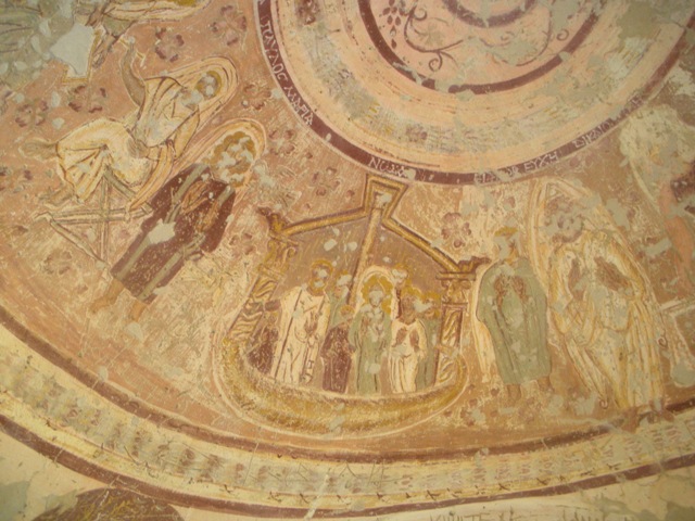 Un canadien commente avec beaucoup d’humour et d’érudition, nous emboîtons le pas au petit groupe dans la Chapelle de l’Exode. Cet épisode est très clairement représenté avec de petits personnages stylisés très colorés : Moïse près d’un palmier brandit son bâton vers le ciel. Son peuple le suit assis sur des jolis ânes gris portant des couffins coloré, à quelque distance, l’armée de Pharaon les poursuit : ils sont habillés en légionnaires romains. Au registre inférieur : une sorte de galère en coupe : les frères de Jonas le jettent par-dessus bord, le fantôme de la baleine grise presque effacée avale Jonas. Si nous avions été érudites, nous aurions aussi reconnu des épisodes de la vie des martyrs qui grillent dans les flammes.