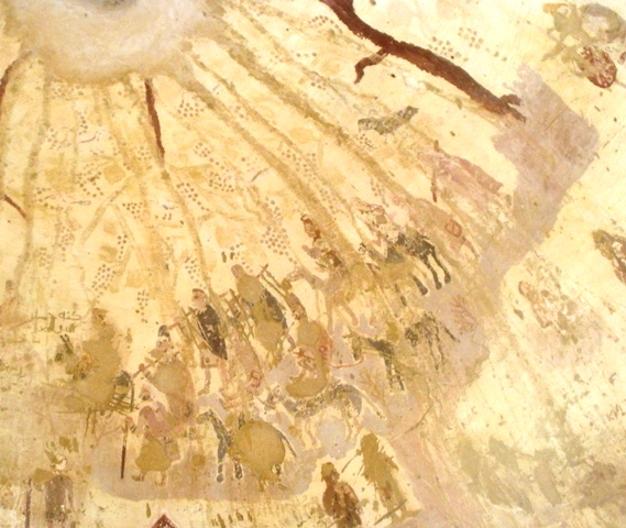 Quelques fresques subsistent. Au hasard, je découvre d’abord la silhouette d’un jeune homme, des pampres et des grappes de vigne sur un plafond.