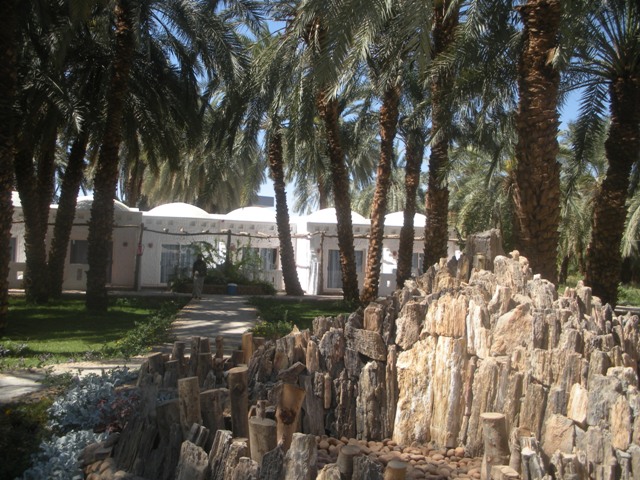 Un beau jardin avec des palmiers – oasis oblique – mais aussi des fleurs. Trois séries de bungalows aux voûtes nubiennes d’une blancheur éclatante avec une minuscule courette et un banc maçonné blanc. Des perches en bois devraient souvenir des pergolas en palmiers pour donner de l’ombre. Les petits jardinets sont plantés de zinnias et de jasmin qui grimpe sur les tonnelles. A l’arrière une palmeraie touffue où poussent également des agrumes.