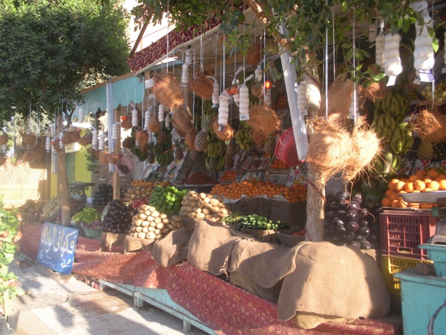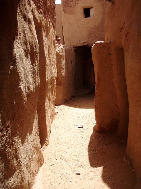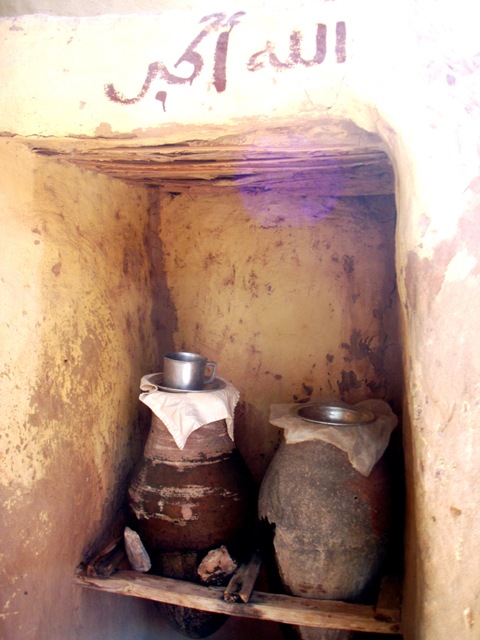 C’est un petit village encore très traditionnel. Nous croisons beaucoup de barbus et des petites filles en uniforme bleu avec un grand voile sortent de l’école. A la différence d’El Qasr, forteresse-musée, Balat est habitée. Le gardien nous fait les honneurs du village. Avec la clé en bois, il ouvre la mosquée. Quelques nattes couvrent le sol, un rideau noir délimite le coin des femmes, un micro est installé pour le muezzin –pas de minaret visible -. Les rues sont saupoudrées d’un fin sable orangé. On aurait envie de se déchausser et de continuer la visite pieds nus. On nous montre aussi le moulin à farine et le point d’au. Ici poussent quelques brins de menthe, là un bananier. Le long du mur s’accroche une liane aux feuilles ressemblant à celles de la courgette : c’est la loufa dont le fruit est un accessoire de toilette.