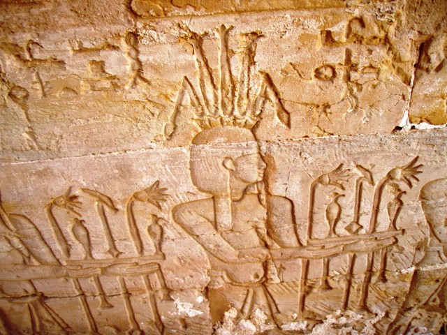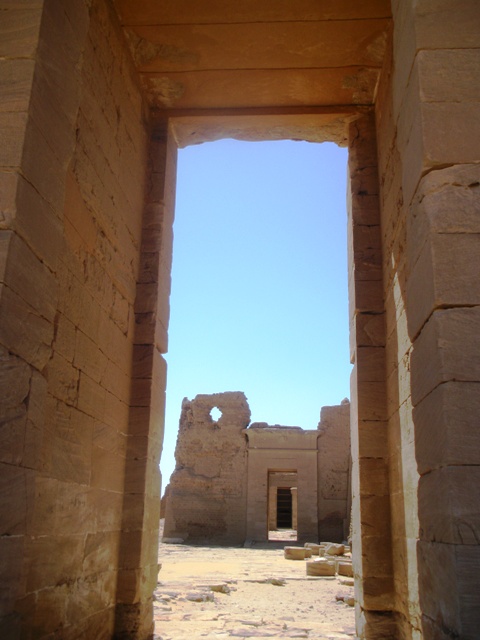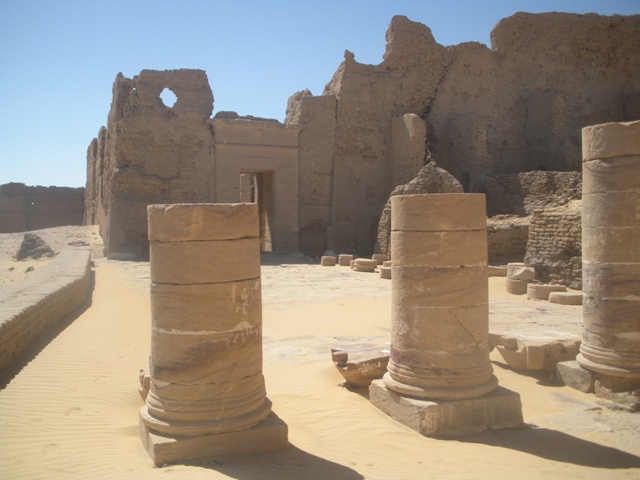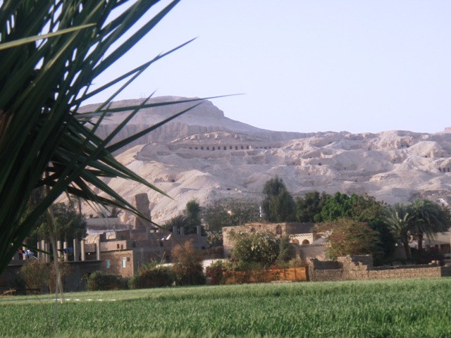 Sur les conseils du Petit Futé, nous voulons rentre à pied en traversant la palmeraie. C’est sans compter sur la vigilance de la Police Touristique qui oppose un refus catégorique. Il nous faut reprendre la route et marcher au soleil ! Un jeune policier habillé en civil nous escorte d’abord en passant devant le temple de l’Hibis : chantier pharaonique, le temple est déplacé de quelques centaines de mètres pour éviter d’être endommagé par des infiltrations. Nous n’en apercevons que les portiques au-delà du chantier.