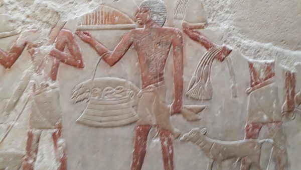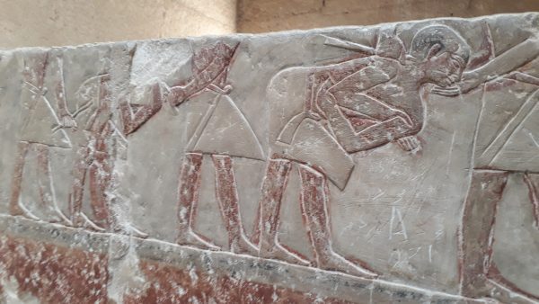 Plusieurs mastabas se visitent, pour certains il faut payer un supplément (Mererouka). Le mastaba d’Idout (2360 av.JC) est la tombe d’un vizir. Desbas-reliefs de scènes de la vie quotidiennes sont très finement ciselées dans un calcaire très fin et très lisse. Dans les scènes de pêche on reconnaît les perches du Nil que nous venons de voir ce matin parmi les différents poissons. Des processions et offrandes avec des bœufs. Une scène originale : celle de la justice où les coupables sont punis.