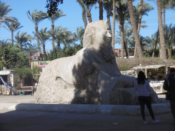Traversant une verte palmeraie, nous atteignons Memphis, l’ancienne capitale des pharaons (3200 av JC) où se trouvaient les palais et les temples, bien ruinés. Rien à visiter pour les touristes : ces édifices étaient destinés à la vie et non à l’éternité comme les pyramides. Les palais n’étaient pas conçus pour durer. A Memphis on vient surtout pour un parc de statues retrouvées dans les environs er surtout le colosse couché de RamsèsII abrité dans un musée. Il est habillé d’un pagne délicatement plissé. Son épée (poignard) est glissée dans une ceinture à motifs en zigzag (représentation de l’eau). De nombreux cartouches sont gravé sur la statue à son nom de naissance et à son nom de couronnement. Genoux, barbe sont aussi parfaitement rendus.