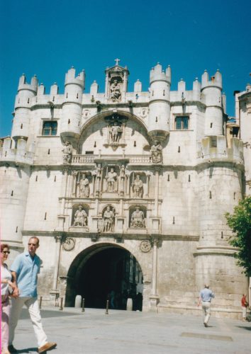 Burgos paraît plus animée que Léon. Toujours des pèlerins randonneurs, des touristes et beaucoup d’Espagnols endimanchés : les mariages se succèdent. La Cathédrale est toute blanche en pierre à grain très fin. Deux tours pointues, légères, aériennes, comme en dentelle ajourée. Une belle rosace surmonte un porche rectangulaire très simple. Sur la façade les rois de Castilles sont alignés. Sur le parvis, une rangée de pinacles pointus et sculptés et une belle fontaine. On voit un merveilleux plafond peint dans une chapelle, sérénité de la messe garantie par des panneaux de verre. Nous ne pouvons pas en visiter plus. Il faut acheter un ticket d’entrée à l’Office de tourisme : longue queue qui n’avance pas et nous décourage. Je renonce, notre temps est compté il reste encore 200km de route . Nous renonçons donc au tombeau du Cid et à toutes les merveilles, je le regretterai plus tard. mais nous avons déjà visité tant d’églises !
