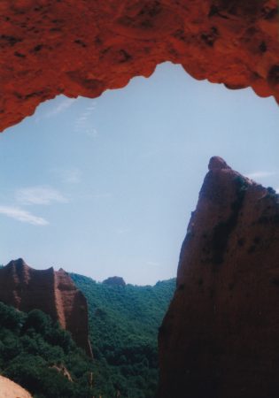 Curieusement, la semaine dernière, le Mondeavait consacré un article aux garimpeiros exploitant l’or du Brésil. Tout ce paysage ruiniforme n’est pas un « caprice » de la nature. Il résulte de l’exploitation humaine. Les Romains ont éventré la montagne. Ils ont creusé de profondes galeries sur plusieurs niveaux. L’érosion de l’eau a fait effondrer des pans entiers de la montagne creusée comme un gruyère. La hauteur de la couche rouge est de 145 m, au dessous, se trouvent les schistes paléozoïques. Les sédiments mal consolidés se sont effondrés en laissant des pics verticaux. Certaines galeries sont encore visitables, d’autres ont disparu, laissant des fontis, cloches et entonnoirs. Nous nous promenons dans les énormes cavernes, découvrons des couloirs.