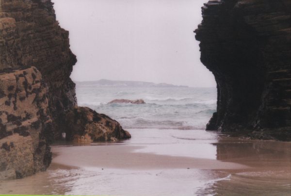 Sur environ deux mètres, la roche est colonisée par les moules dans les creux, et les balanes. Des amoureux ont gravé leurs noms et une date : Juillet 2002 dans une colonie de balane. La trace est très nette. Cela me rassure : le pétrole du Prestige n’a pas fait son arrivée en masse ? Le noir observé plus haut ne peut pas lui être imputé. Il se manifeste sous forme de petites galettes ou de petites boulettes ? Nous explorons méthodiquement tous les creux. . Je prends photo sur photo comme chaque fois qu’un endroit me plaît. Et, comme toujours, la pellicule se termine justement dans le coin le plus pittoresque quand, par une fente, on voit les vagues se briser au loin et qu’au premier plan, une vasque d’eau claire laisse entrevoir les rides sur le sable.