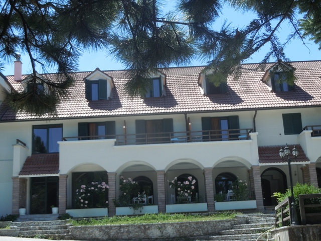 Quelques km plus bas nous trouvons l’Hôtel Alpinà la façade blanche et aux volets verts. Au rez de chaussée les arcades sont fleuries de rosiers , au 1er étage les chambres s’ouvrent sur des balcons. Dans la toiture il y a des fenêtres carrées. Une cour pavée sert de parking. Sur le côté, une salle à manger d’été est rafraîchie par un ruisseau, des bassins et une fontaine. De beaux pins bien fournis isolent l’hôtel de la route assez passante.