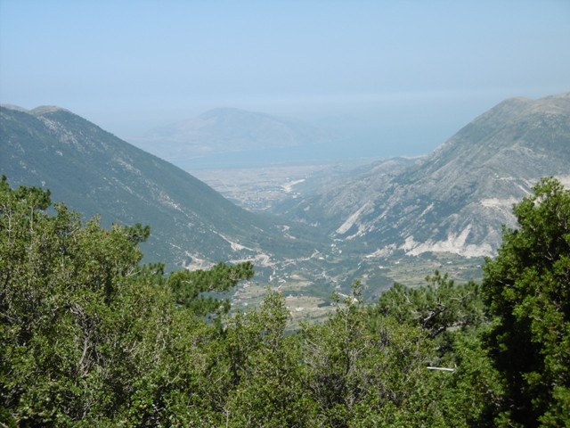L’hôtel a donné une carte du Parc de Llogara et de la région d’Orikum avec les descriptifs des visites et des promenades.la plupart des randonnées de montagne sont longues, plus de 4h et doivent se faire le matin. Il fait beaucoup trop chaud l’après midi. je sélectionne la plus courte d’une heure 1h30 à partir du village de Dukat. Du grand platane jusqu’à la Tour du DervicheAli. Dukat n’est pas dans le Parc National de Llogara qui englobe la forêt mais pas la campagne environnante. Les maisons s’étagent sur le versant est, le village est à 380m d’altitude, puis o n traverse la vallée du torrent Rhodina aux rochers ruiniformes, il y coule un peu d’eau. De la place du village, le sentier est bien balisé, il traverse le village par les arrière-cours et les jardins, les tonnelles et les figuiers s’accrochant aux murs en ruine. Un arbre à kaki (plaqueminier)dépasse d’un mur ; Des poules picorent près d’un tas de fumier. Les marques rouge et blanches me conduisent en dehors du village jusqu’à des tombes musulmanes puis ans la campagne, dans le torrent à sec. Distraite par le passage furtif d’un animal, un chien probablement. Je n’en mène pas large, perds les balises. Je monte dans le lit du torrent, arrive à la base d’un bois de pin. Le sentier disparaît, je rebrousse chemin. Si j’avais lu plus attentivement le topo-guide j’aurais descendu le torrent au lieu de monter.