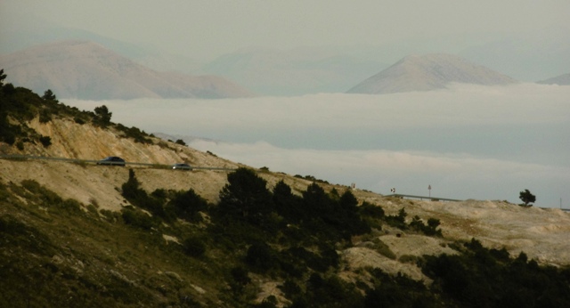 La dame de l’Hôtel nous conseille de monter au col, à 19h30, précises. Ce nest pas un ban al coucher de soleil mais un spectacle inattendu. La montagne au dessus de Sarandë, Corfou émergent de la brume comme d’une légère mer de nuages. A nos pieds le nuage se forme, monte et s’effiloche. Les petites îles ont des contours précis, le bateau de croisière prend des teintes rosées. Spectacle saisissant et si difficile à photographier, évanescent, avec des couleurs opalines, sans contraste, fascinant !