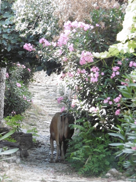 Le village est encore habité, même si accéder est un exploit pour nous. Une vieille dame qui tricote devant sa porte me demande « Pou pais ? », il me parait normal de lui répondre en grec. Les porches des maisons sont encadrés d’un bel arc roman en pierre calcaire taillée soigneusement. Les murs en moellons plus grossiers sont badigeonnés de chaux ; les lauriers roses sont magnifiques. Tous les bords de la route en sont fleuris.