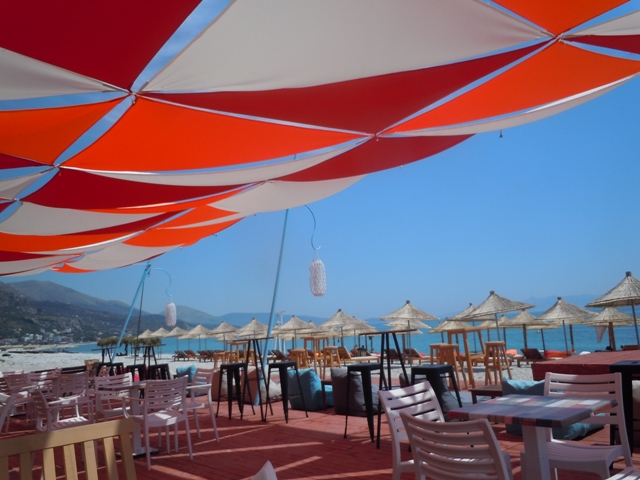 D’Orikum à Vlorë, le littoral est occupé par les établissements balnéaires et les marinas. Des complees immobiliers très récents poussent – bétonnage navrant et gâchis de paysage.