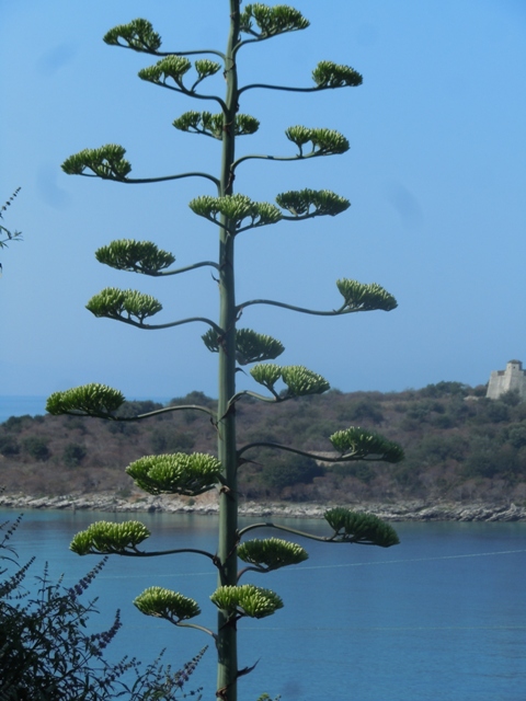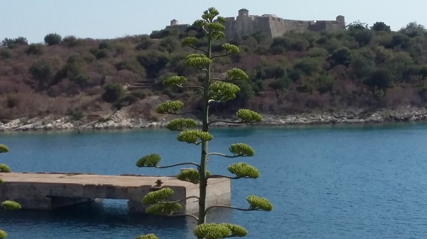 Porto Palermo est la jolie baie entre Himarë et Barsh. Sur les pentes poussent des agaves merveilleusement verts. Une petite île reliée à la terre par un tombolo de sable renforcé par des roches porte une forteresse construite par Ali Pacha .Entre l’île et la colline une digue en ciment fait un petit port de pêche. Deux petites plages portent quelques parasols. A une extrémité, un peu en hauteur est installée une taverne que nous avons remarquée hier et où nous nous sommes promises de revenir La vue est parfaite, je prends mon temps pour dessiner le paysage. Dans la baie voisine, s’ouvre un curieux tunnel, une base secrète pour les sous marins ?