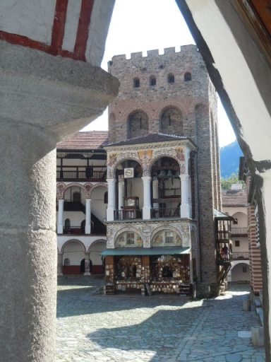 Dans la plupart des édifices religieux, l’Histoire explique ces disparités ; On ajoute, on remanie, on modernise. A Rila, seule la grosse tour carrée est antérieure aux bâtiments du 19ème siècle. L’aile neuve où nous logeons est 20ème. Fondé au 10ème siècle puis déplacé en 1335, le monastère fut rasé par Murad II qui, ensuite, favorisa sa reconstruction. Brûlé en 1833, le monastère fut reconstruit au cours du 19ème siècle.