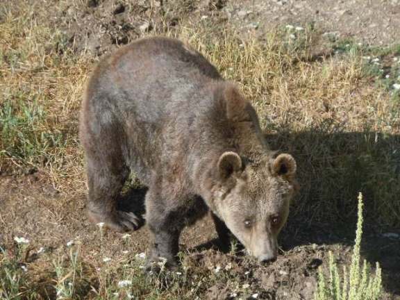 Le Parc des Ours se trouve à 11km de Belitsa, dans la vallée voisine de celle de Dobarsko. Belitsa est un gros bourg où église et mosquée coexistent. On nous avait prévenues : la piste des ours est très mauvaise. Les 5 premiers kilomètres sont goudronnés. Des attelages partent au travail, des bergers s’appuient sur leur houlette, matinée tranquille en moyenne montagne. Les nids de poule se font plus nombreux que la normale, l’asphalte a été grignoté de côté, formant parfois une marche. A la fin il n’y a plus qu’une mauvaise piste ravinée avec des rochers qui affleurent. Nous sommes motivées. Nous voulons voir les ours ! Après 6km de cette mauvaise piste, nous touchons au but.
