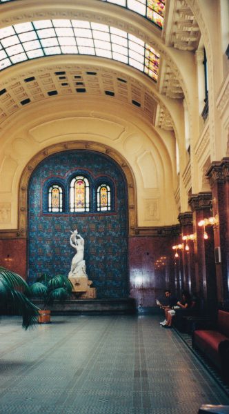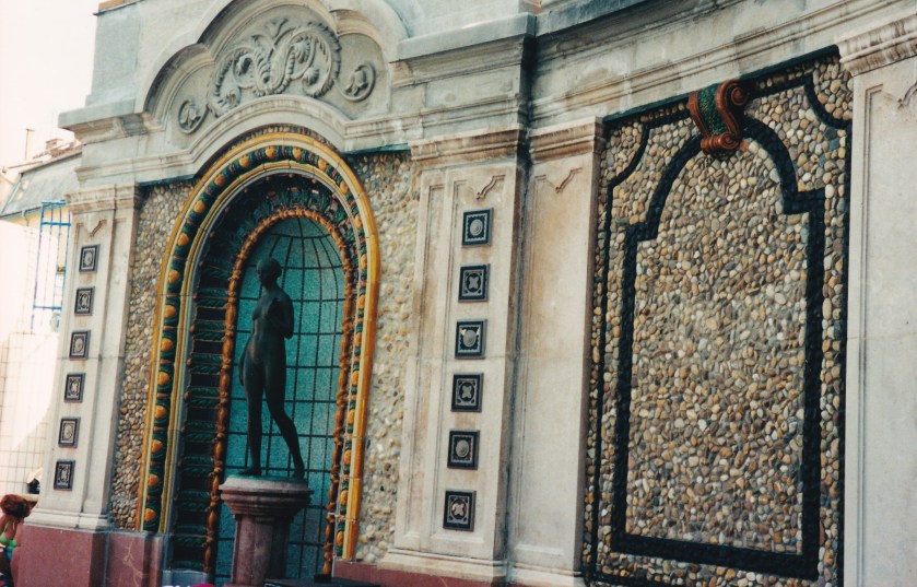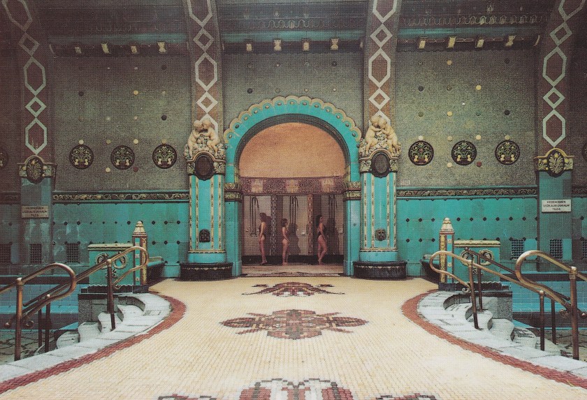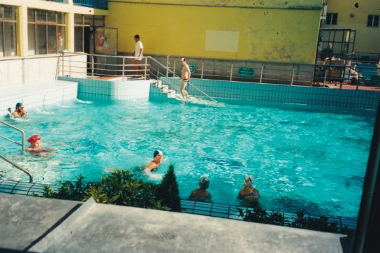 Ici, ce n’est pas le charme Belle Epoque, les thermes sont modernes, béton et verre. L’entrée de la piscine est surmontée d’une étoile socialiste en béton formant un auvent immense où sont installés des marchands ambulants.