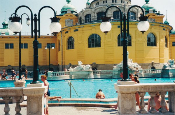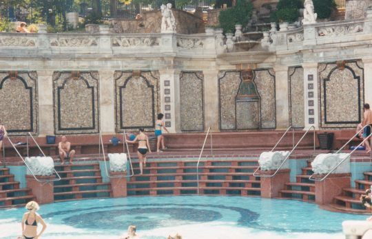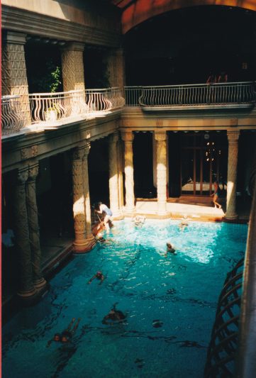 Un haut parleur annonce quelque chose, toutes les piscines se vident de leurs occupants qui se précipitent vers un bassin entouré de hauts murs : les vagues. J’imite la foule, tout le monde est debout presque aussi serrés que dans le métro à six heures, et attend la vague. Oublié le calme des bains distingués de Budapest. Ici, le public est familial avec beaucoup d’enfants et d’adolescents. S’il y moins de cris de poursuites et de plongeons qu’en France, il n’est pas possible de nager. L’occupation à la mode ici c’est de jouer à la balle par dessus la tête des autres baigneurs. On peut aussi éclabousser les passants avec de gros bazookas à eau.