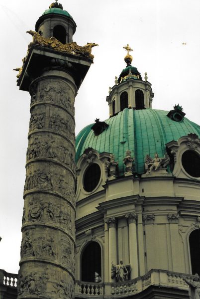 La colonne de la Peste rappelle le chœur de Karlskirche, encore des angelots débordant d’un nuage. En suivant nos guides on débusque les maisons les plus spectaculaires : le Palais Equitable, gros et noir renfermant une cage d’escalier en marbre donnant sur un patio fermé par une verrière.