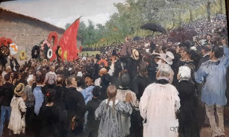 Ambiguïté des productions de Répine qui peint en couleurs joyeuses la Révolution de 1905et un rassemblement au Mur des Fédérés