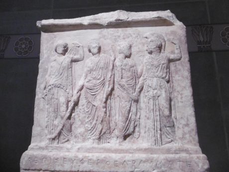 Après la déambulation parmi les statues nous arrivons au bout de la salle pour découvrir, de dos, les caryatides. Je n’aurais pas imaginé qu’elle seraient aussi grandes et aussi belles. De dos, leur chevelure est abondante, avec une coiffure compliquée, sorte de tresse très souple retenue par un ruban. Les boucles se répandent dans le dos. Leur vêtement est aussi très délié et très délicat. On suppose qu’elle venaient de l’atelier de Phidias. Le musée n’en possède que 5, dont une atteinte par un boulet turc. La 6ème se trouve au British Muséum.