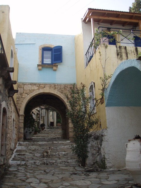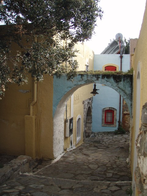 Au jour, nous découvrons le paysage montagneux. Le village d’Arolithos a été transformé en hôtel. Les plaques des rues sont pentes de couleurs vives.