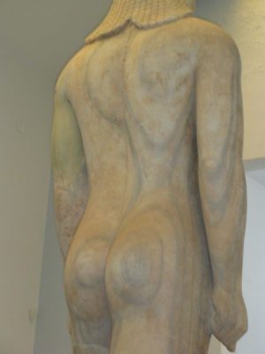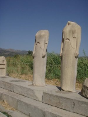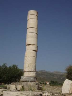 J’ai été surprise par l’étendue du site. Je m’attendais à voir une seule colonne aux tambours décalés (un eu dans le genre de la colonne Pompée à Alexandrie). L’énorme temple d’Héra commencé au 6ème av JC sous Polycrate est bien visible. Il faudrait que je retrouve les photos de lui de Didymes, tout proche, de l’autre côté de la Mer Egée en turquie. Nous ne sommes à vol d’oiseau qu’à une dizaine de km d’Ephèse !les panneaux explicatifs sont très bien faits. On découvre tout un ensemble de temples d’Héra, le monumental et un plus petit édifié par Roikos, un autel où l’on brûlait les offrandes, énorme lui aussi, dallé au sommet de serpentine verte qui devait trancher sur le marbre blanc. La Voie Sacrée conduisait à l’Antique Samos bordée de Trésors (comme à Delphes). Il faut un gros effort d’imagination pour les reconstruire. Les fondations sont à peine visibles, enchevêtrées. Je convoque mes souvenirs pour visualiser les petits bâtiments alignés. Les statues des korês de Genelos (copies) indiquent le départ de la Voie Sacrée bien dallée que nous parcourons.