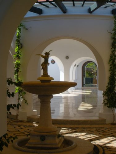 Sur le bord de la crique l’ombre des grands arbres,on loue des lits de plage jaunes (10€ pour 2) ou si on préfére, des fauteuils de rotin tressé très contemporains et classieux au bar distillant une musique bruyante d’un style indéfini, un rock aquatique, peut être ? les jeunes colonisent le bar tandis que les familles s’installent près de l’eau. Bidons et bouteilles délimitent une zone de baignade qu’on est bien inspiré de ne pas dépasser. Des bateaux à moteur débarquent des cargaisons de baigneurs avec ou sans flotteurs qui barbotent autour de ces embarcations. Tandis que je nageais tranquillement guettant les poissons (comment traduit on en français snorkelling ?) le bruit d’un bateau m’a surprise. Je me suis épuisée à nager vite pour fuir. La tête sous l‘eau, j’ai perdu le sens de l’orientation et je me suis retrouvée sur l’autre bord, haletante et le masque plein d’eau !ce n’est qu’après la baignade que nous avons découvert le petit pavillon circulaire de l’établissement de cure, les mosaïques autour de la jolie petite statue et par les arches, un très beau paysage de côte rocheuse découpée sur la mer d’un bleu profond souligné par les agaves et les pins. Un festival musical s’y déroule fin juin début juillet. Point de cure ni de curiste, un endroit kitsch ravissant !
